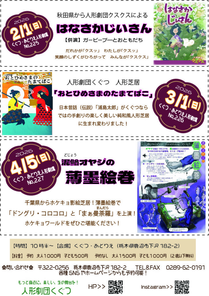 春までのくぐつ・あとりえ人形劇場のスケジュールがでましたのでお知らせいたします。